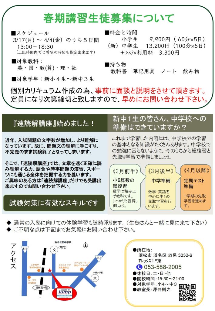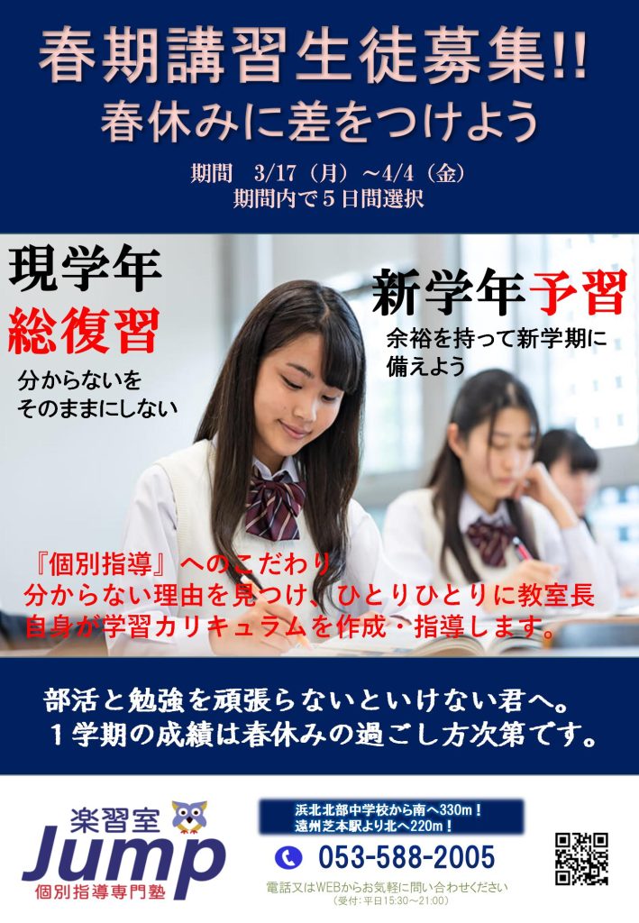 浜松市浜名区の個別指導専門塾『楽習室Jump』から、春期講習生募集のお知らせです。