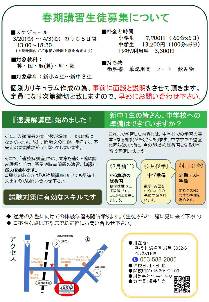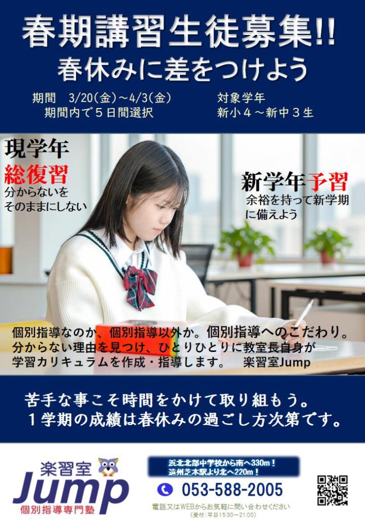 浜松市浜名区の個別指導専門塾『楽習室Jump』から、春期講習生募集のお知らせです。